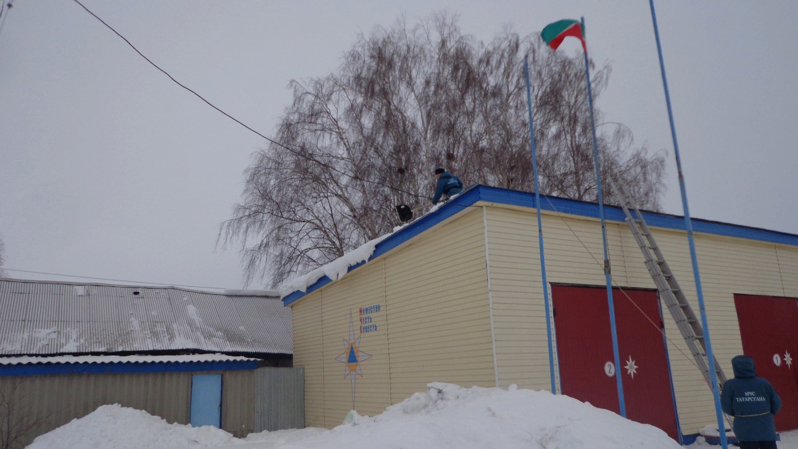 После обильных снегопадов с целью снижения нагрузки на кровлю и несущие конструкции здания пожарного депо, а также своевременного принятия мер по недопущению схода наледи и снега работниками отдельного поста по охране с. Омары Сабинского отряда противопожарной службы Республики Татарстан проведена очистка кровли здания от снега и льда с соблюдением требований охраны труда.
