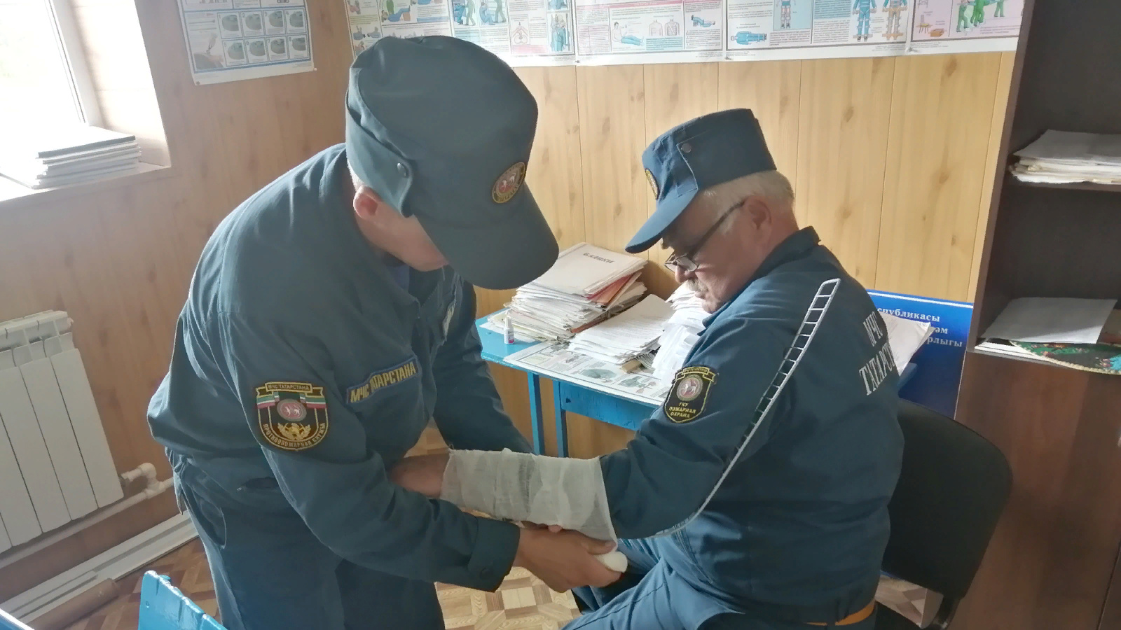 В целях совершенствования приемов и способов действий личного состава при оказании первой медицинской помощи с личным составом отдельного поста по охране села Большие Полянки Чистопольского отряда противопожарной службы Республики Татарстан отработан норматив № 11.5 «Наложение шин из подручного материала при переломе костей плеча».