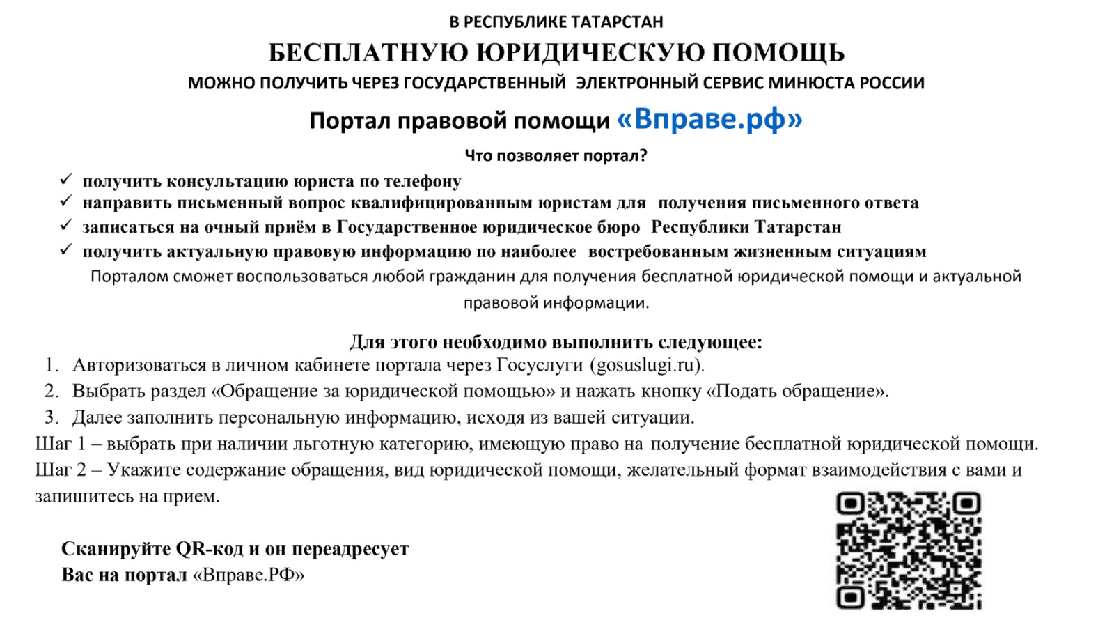 В Республике Татарстан бесплатную юридическую помощь можно получить через государственный электронный сервис Министерства юстиции Российской Федерации.