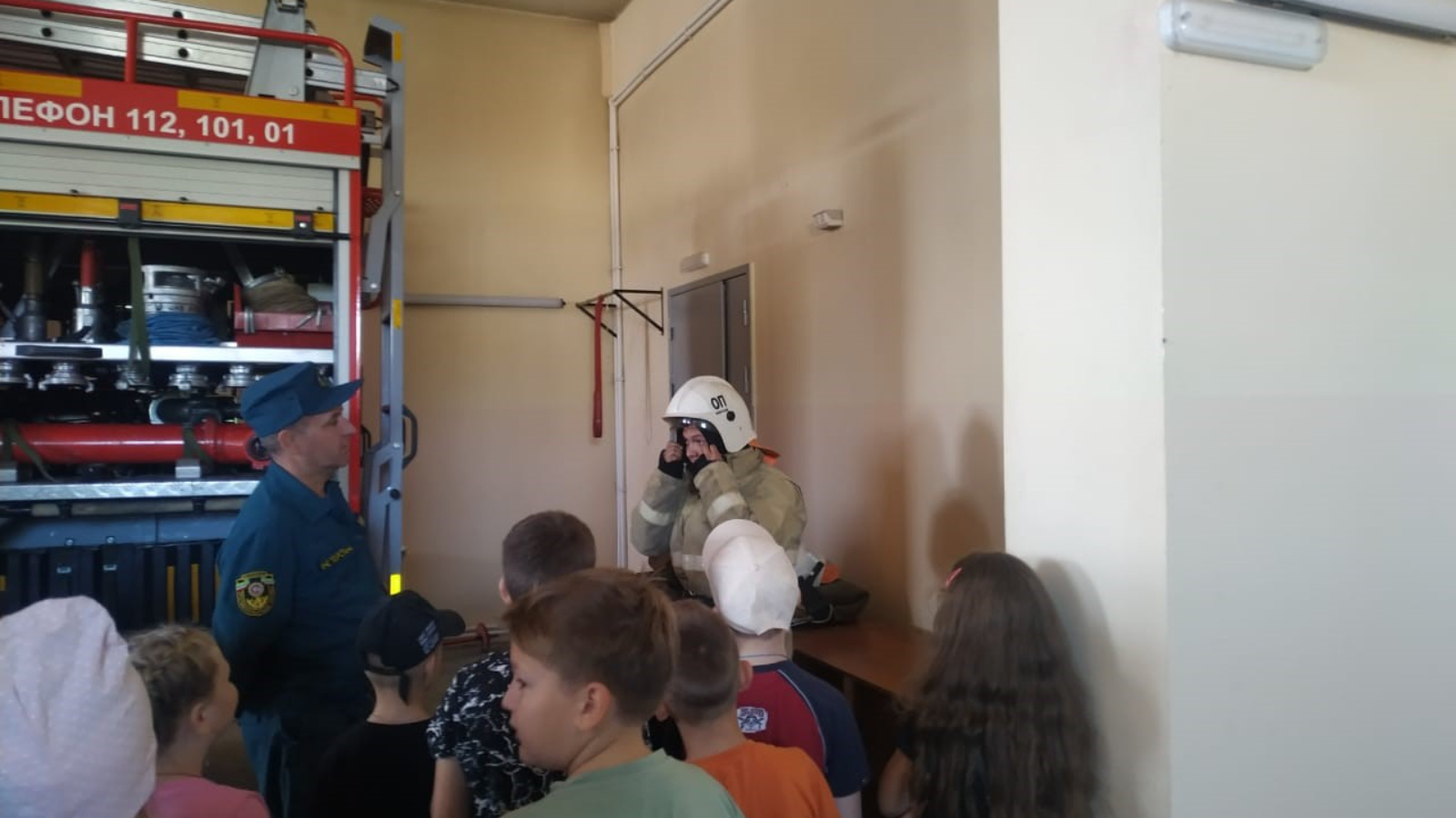 Работники отдельного поста постарались и устроили для ребят настоящее представление. Сначала провели экскурсию по служебным помещениям, затем познакомили ребят с пожарной техникой, рассказали о специальном пожарно-техническом вооружении, продемонстрировали процесс надевания боевой одежды пожарного.