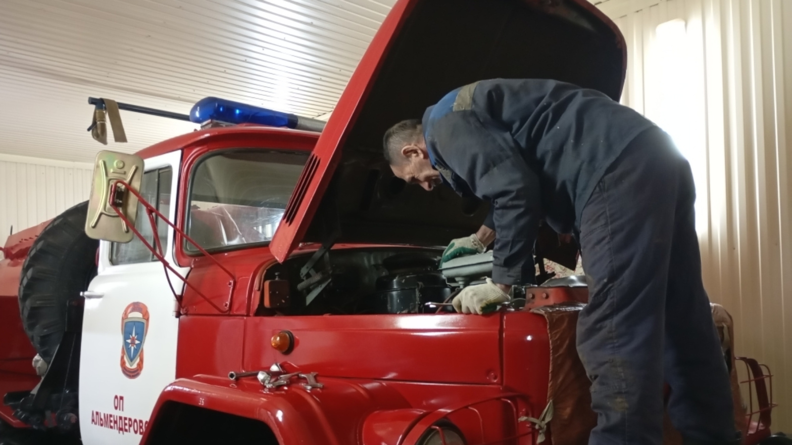 Одним из главных факторов для ведения успешных действий по тушению пожаров является технические состояние пожарных автомобилей. С целью предупреждения отказов и поломок, обеспечения бесперебойной работы и поддержания в постоянной боевой готовности пожарной техники, проводится комплекс мероприятий по техническому обслуживанию пожарных автомобилей. Так, водительским состав отдельного поста по охране села Альмендерово Апастовского отряда противопожарной службы Республики Татарстан проведено техническое обслуживание пожарного автомобиля АРС-14 (Зил-131). В рамках которого проверены узлы и агрегаты автомобиля, двигатель автомобиля, а также проверено состояния АКБ.