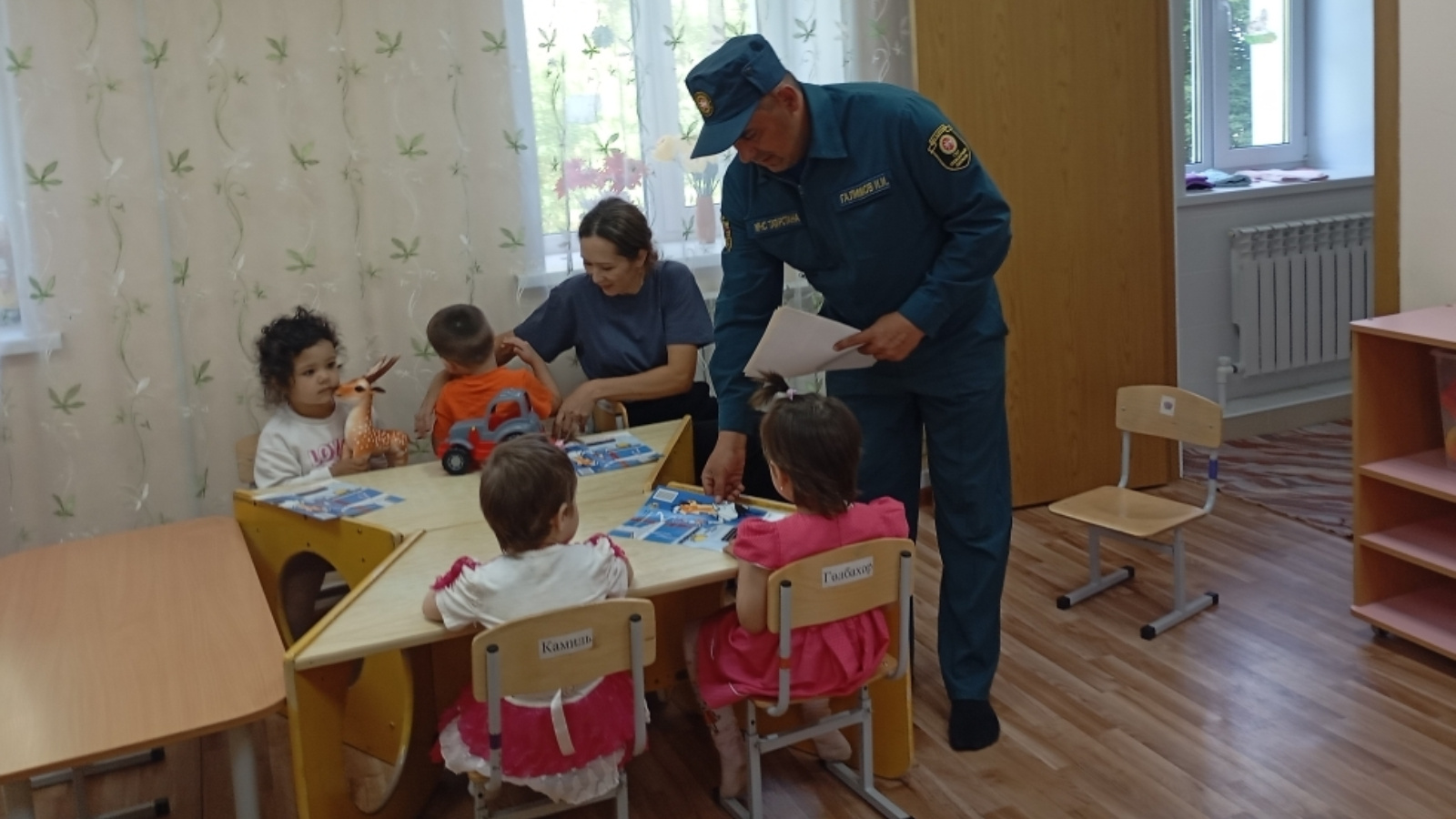 В целях ознакомления детей с требованиями пожарной безопасности во время летних каникул, командир отделения отдельного поста по охране села Альмендерово Апастовского отряда противопожарной службы Галимов И.И. провел занятие по обучению детей правилам пожарной безопасности в детском саду с. Альмендерово.