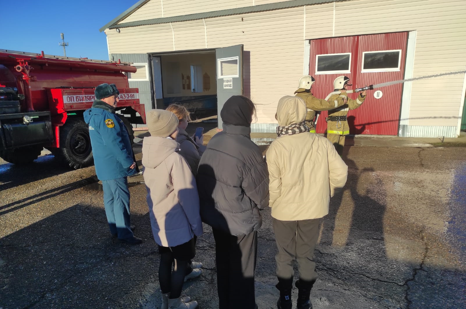 Экскурсия началась с знакомства с профессией пожарного. Ребята увидели, как организована работа дежурного караула, побывали в учебном классе и гараже, узнали о распорядке дня работников противопожарной службы. Особый восторг вызвала возможность посидеть за рулем пожарного автомобиля и примерить боевую одежду.
