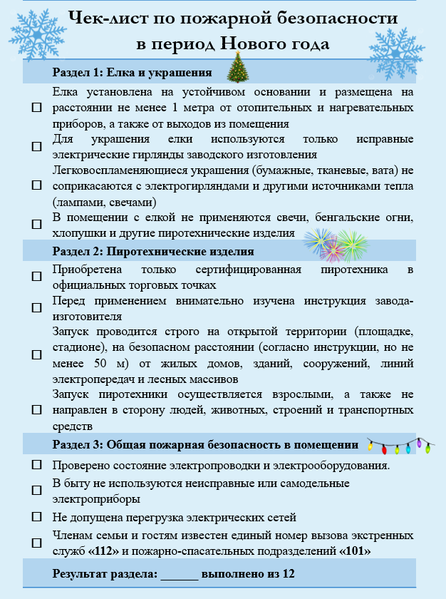 Мы подготовили для вас понятный пошаговый чек-лист, который проверит: правильность установки и украшения новогодней ёлки, безопасность использования электрогирлянд и пиротехники, готовность вашего жилья к празднику.