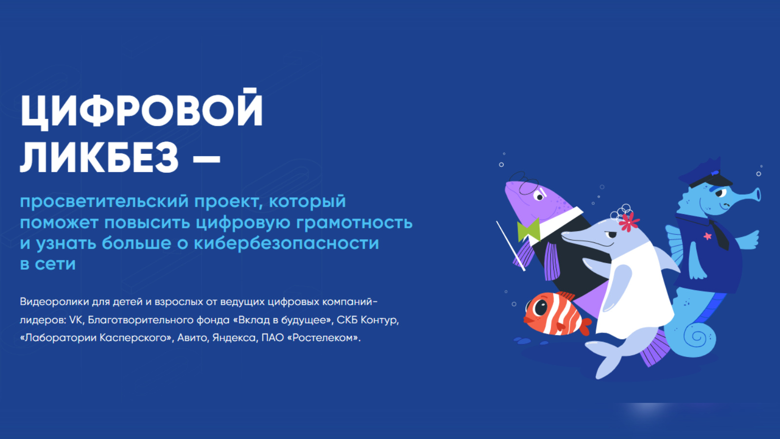 «Цифровой ликбез» – всероссийский просветительский проект в сфере цифровой грамотности, организованный АНО «Цифровая экономика», Минцифры России и Минпросвещения России. Проект включает в себя серию просветительских мультипликационных роликов и методических материалов для педагогов, которые на понятных примерах учат детей и взрослых азам цифровой грамотности и кибербезопасности. Видеоролики от ведущих цифровых компанийлидеров – VK, Благотворительного фонда «Вклад в будущее», СКБ Контур, «Лаборатории Касперского», Авито, Яндекса, ПАО «Ростелеком».