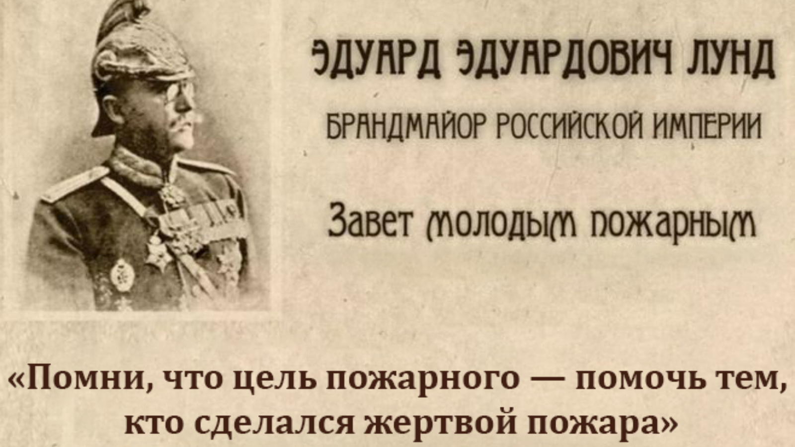 Этот день объединяет людей несгибаемой воли, для которых честь, мужество и верность служебному долгу — не просто слова, а смысл всей жизни. 30 апреля 1649 года царь Алексей Михайлович Романов подписал «Наказ о градском благочинии». Именно с того указа ведёт свой отсчёт славная история службы, которой в этом году исполняется 377 лет. И во все времена девизом каждого из вас были слова Эдуарда Эдуардовича Лунда: «Помни, что цель пожарного — помочь тем, кто сделался жертвой пожара».